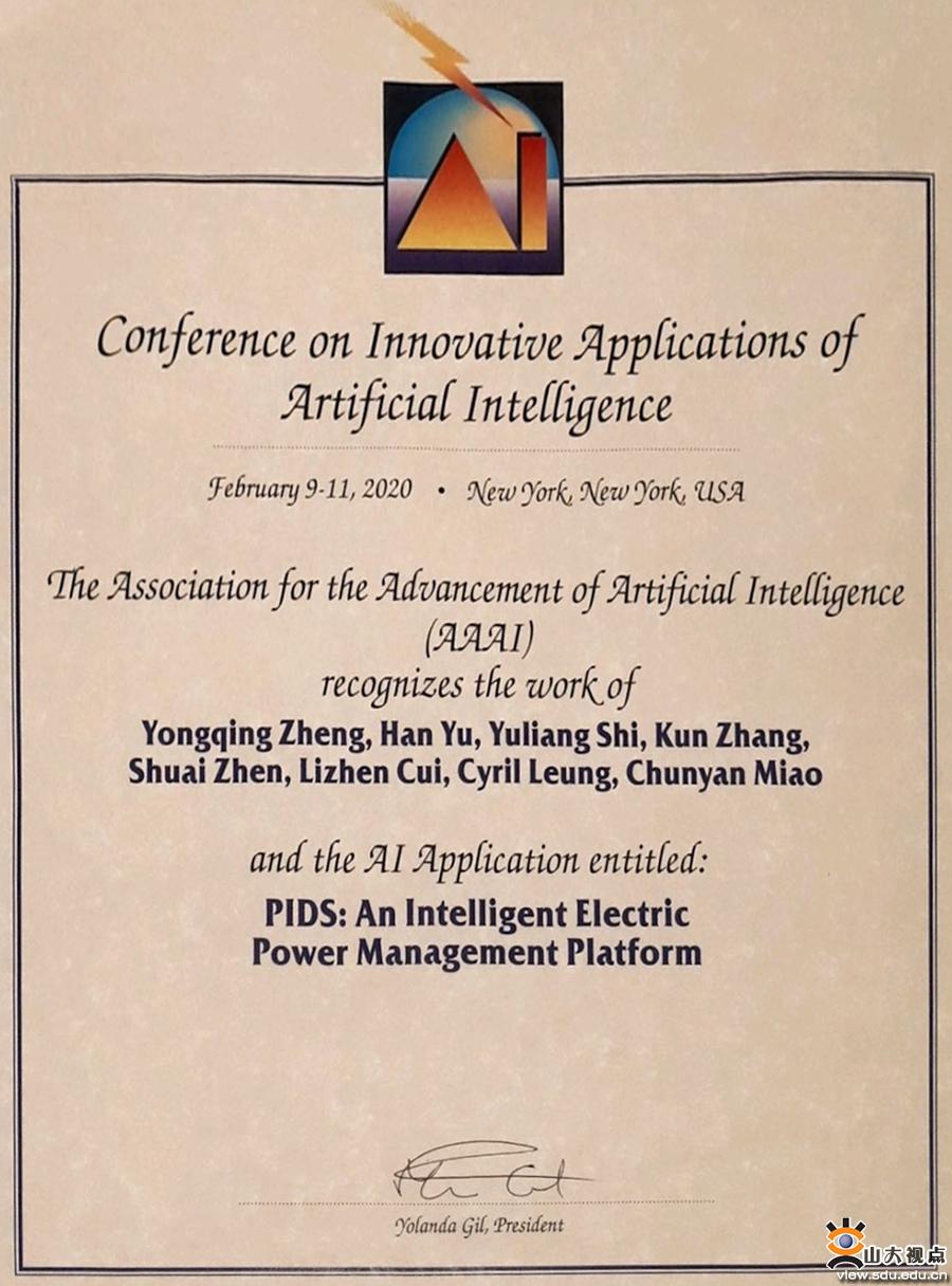 2020年2月,C-FAIR基于山大地纬应用背景,产教协同创新,再获人工智能国际顶级会议AAAI创新应用奖。