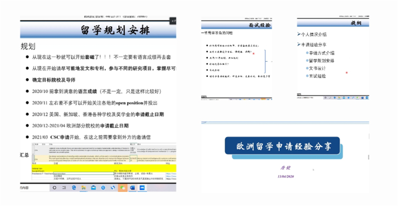 会议伊始,兼职辅导员徐萌先像同学们介绍了2020年的整体就业规划,然后由出国深造毕业生代表唐健结合自身经验,就申请方式、留学规划安排、文书设计和面试经验等方面进行了详细介绍。唐健建议同学们若要出国深造应提早准备,尤其在简历、套磁和研究计划等方面应根据不同的项目要求作相应修改和补充。