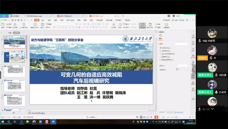 继续教育培训网首页西北工业大学“三航杯”大学生课外学术科技作品竞赛是我校传统的学生科技活动,该项赛事引导和激励广大学生学习科学知识、科学方法,培育实事求是、脚踏实地的科学精神,培养创新能力和实践能力,全面提高科学素养。为了让更多同学了解“三航杯”竞赛,营造良好的科技竞赛氛围,2020年4月19日,动力与能源学院面向全院同学开展“三航杯”竞赛经验分享会,本次分享会吸引了近百位同学前来聆听。