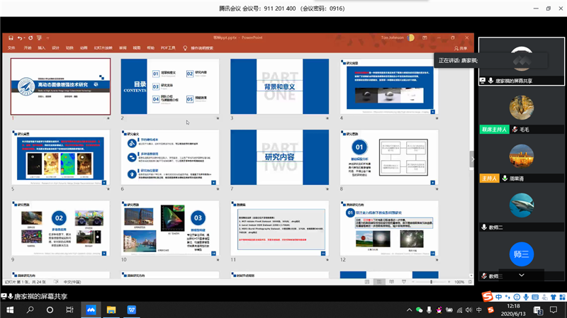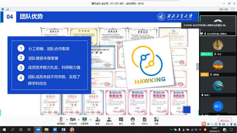 继续教育培训网首页2020年6月13日,计算机学院以腾讯会议模式举行2020年大学生创新训练项目(以下简称“大创”)立项评审会,参加大创评审会项目共计32项,分上午和下午两场会议进行。计算机学院四系主任史豪斌、周果清副教授、潘炜副教授、于会副教授,有丰富竞赛指导经验的老师们担任评审专家,岳媛担任答辩秘书。