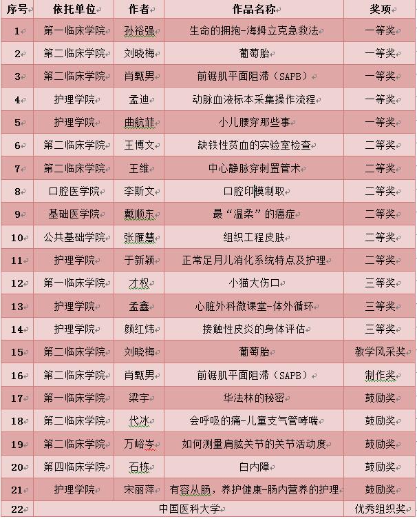 全国高校(医学类)微课教学比赛由教育部与《高校医学教学研究(电子版)》杂志联合举办,旨在促进课程教师专业发展和教学能力提升,推动教学模式改革和教学质量持续提高。比赛共有来自25 个省(市、自治区)的93所高校提交了835件作品,评选出一等奖34名、二等奖63名、三等奖68名、教学风采奖11名、教学设计奖14名、制作奖11名等奖项,以及优秀组织奖30所院校。