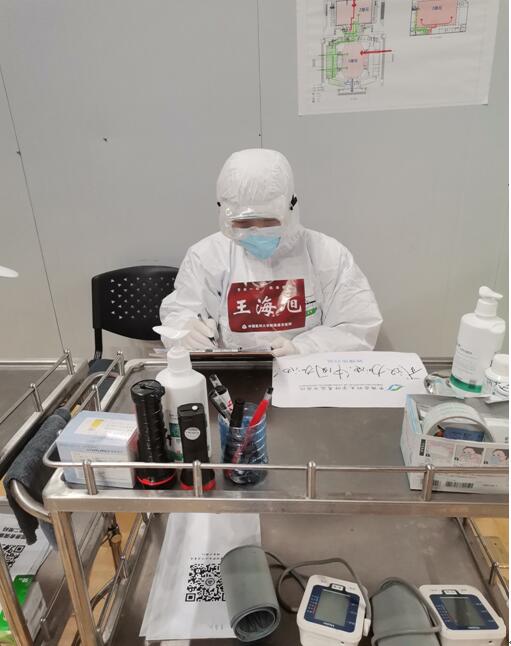 “手把手”指导、“一对一”考核,确保岗前熟练掌握。记得有一天连续反复教医护人员穿脱防护用品,当时觉得特别饿,一看已是下午2点多,才想起还没吃上午饭,但陆续前来的队友高涨的热情、信任的眼神、认真的倾听让我没有理由暂停,喝了口水继续培训,当看到战友们熟练掌握后的自信和从容,我觉得特别充实。在即将入舱开展医疗任务的前夜,应首批入舱队友需求,再次强化培训到半夜,看到大家熟练掌握,信心满满,虽身心疲惫,声音嘶哑,但作为感控人为医务人员防护安全保驾护航的责任感和使命感却更加强烈。每天早7点半,我在方舱医院更衣室开始了一天的工作,医疗、护理、保洁等人员每隔几个小时就要进舱,还有其他工作需要的人员临时进舱,这时我就会在现场指导、协助、检查进舱人员正确穿戴防护用品,并告知他们穿脱注意事项,近视镜及护目镜抗雾处理、医用防护口罩鼻夹塑造及气密性检查、隔离衣背后系带、防护服粘贴密封胶条、护目镜等防护用品舒适性及可靠性调整、写名字、贴身份标识等,我的这些“辅助”操作特别受欢迎,总是应接不暇,我恨不得生出三头六臂同时帮大家“搞定”,同时我会大声提醒“大家一定相互检查防护用品穿戴是否正确可靠,确认无误再进舱,保护好自己,加油!”。除此之外,我还在病区外围及舱内巡视、指导、落实消毒、隔离等感控工作,进舱现场教患者“六步洗手法”等手卫生知识和技能,并与医护人员现场制作“少聚集、多通风、勤洗手、戴口罩”等感控标语对患者进行宣教,在出舱通道粘贴提示标识并现场指导、协助医疗、护理等人员防护用品正确脱卸,虽然每天都工作到很晚,但能为战友们做好科学防护做点儿事情,加油鼓劲,让他们放心进舱,平安返回,我就觉得安心、踏实。