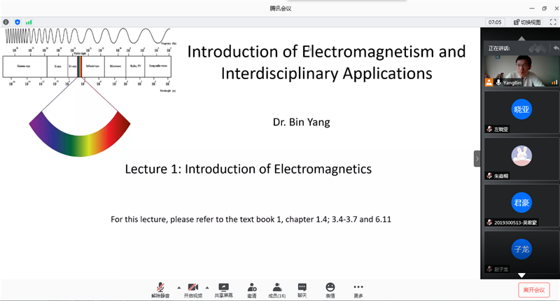 Yang博士的授课在腾讯视频会议软件上进行,授课进行了2周,每周的周一到周五的下午5:00到8:00(附加2个小时在线仿真实验讲解)在线授课。他的讲课联系电磁基本知识和前沿科学研究相结合,共分为5大部分内容:1)通过电磁波和频谱基础理论,讲解不同频段频谱的生活应用;2)通过讲解电磁波在介质中的传播理论,讲解使用电磁波来研究物质特性的工具(包括XRD,