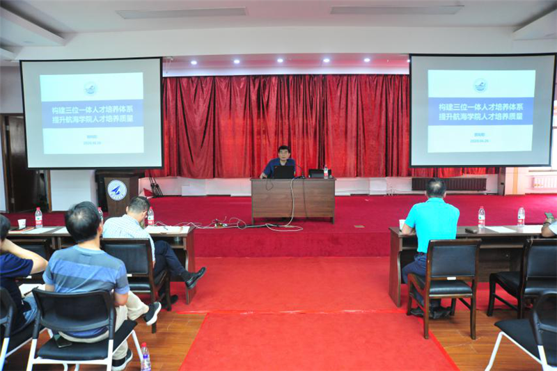 曾向阳做本科人才培养治理体系工作汇报。曾向阳围绕构建三位一体人才培养体系,提升航海学院人才培养质量主题,提出要针对现存问题,从生源、价值塑造、实践平台、课程资源建设、专项计划、教师教学能力培养、全过程管理等方面深化改革工作,实施4项计划,全面提升本科人才培养水平。