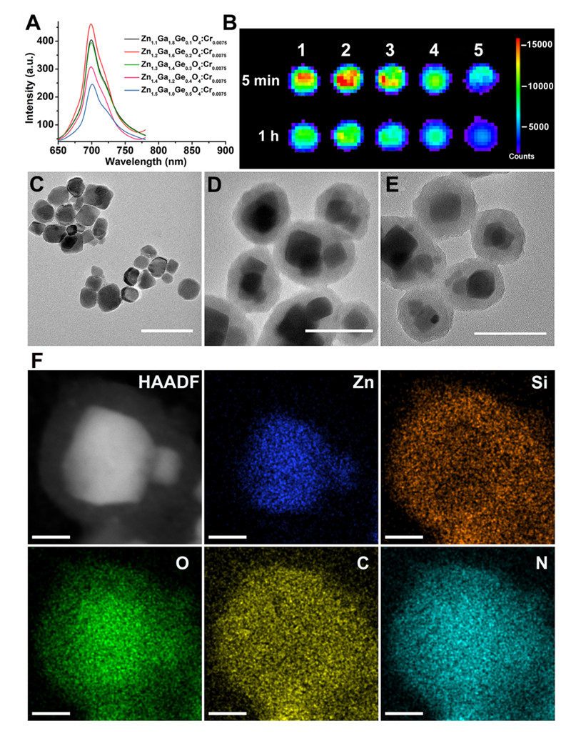 LPLNP@SPP合成及表征。(A,B)长余辉纳米材料发射光谱及余辉性质表征;(C-E)长余辉纳米材料及复合物透射电镜表征;(F)LPLNP@SPP能谱表征