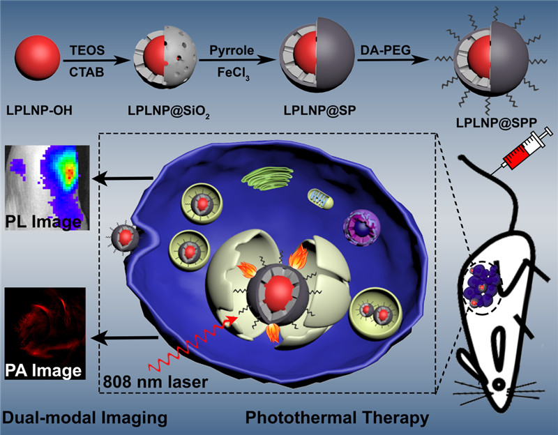 乳腺癌是女性最常见的恶性肿瘤之一,肿瘤侵袭性高,预后差。急需要高灵敏成像和高效治疗手段。作者设计合成了长余辉-聚吡咯纳米复合物(LPLNP@SPP)用于乳腺癌的余辉/光声双模态成像和光热治疗。论文中优化了长余辉纳米材料的配比,得到了具有700 nm发射的长余辉纳米材料,余辉时间超过24小时。通过后续水热和化学氧化的方法将二氧化硅和聚吡咯壳层依次包覆在长余辉纳米材料表面,经过表面修饰后得到具有双功能的LPLNP@SPP(图1)。