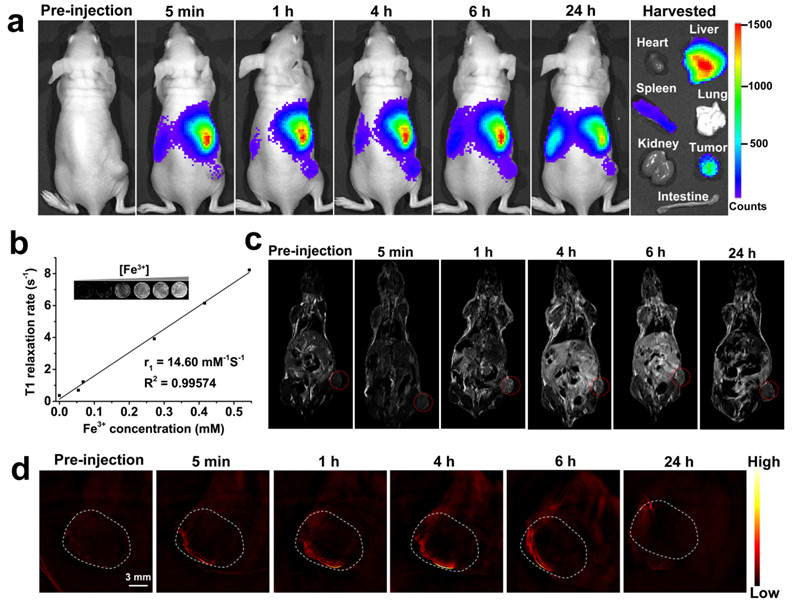 图4.长余辉纳米复合物PHFI多模态成像效果。(a)余辉成像;(b,c)核磁成像;(d)光声成像