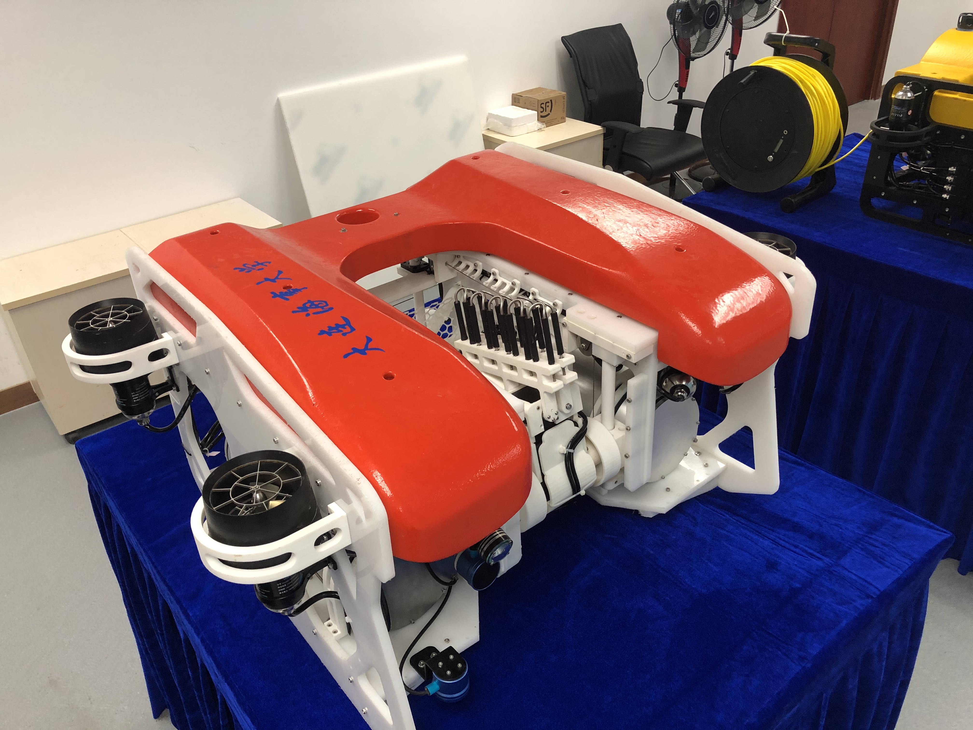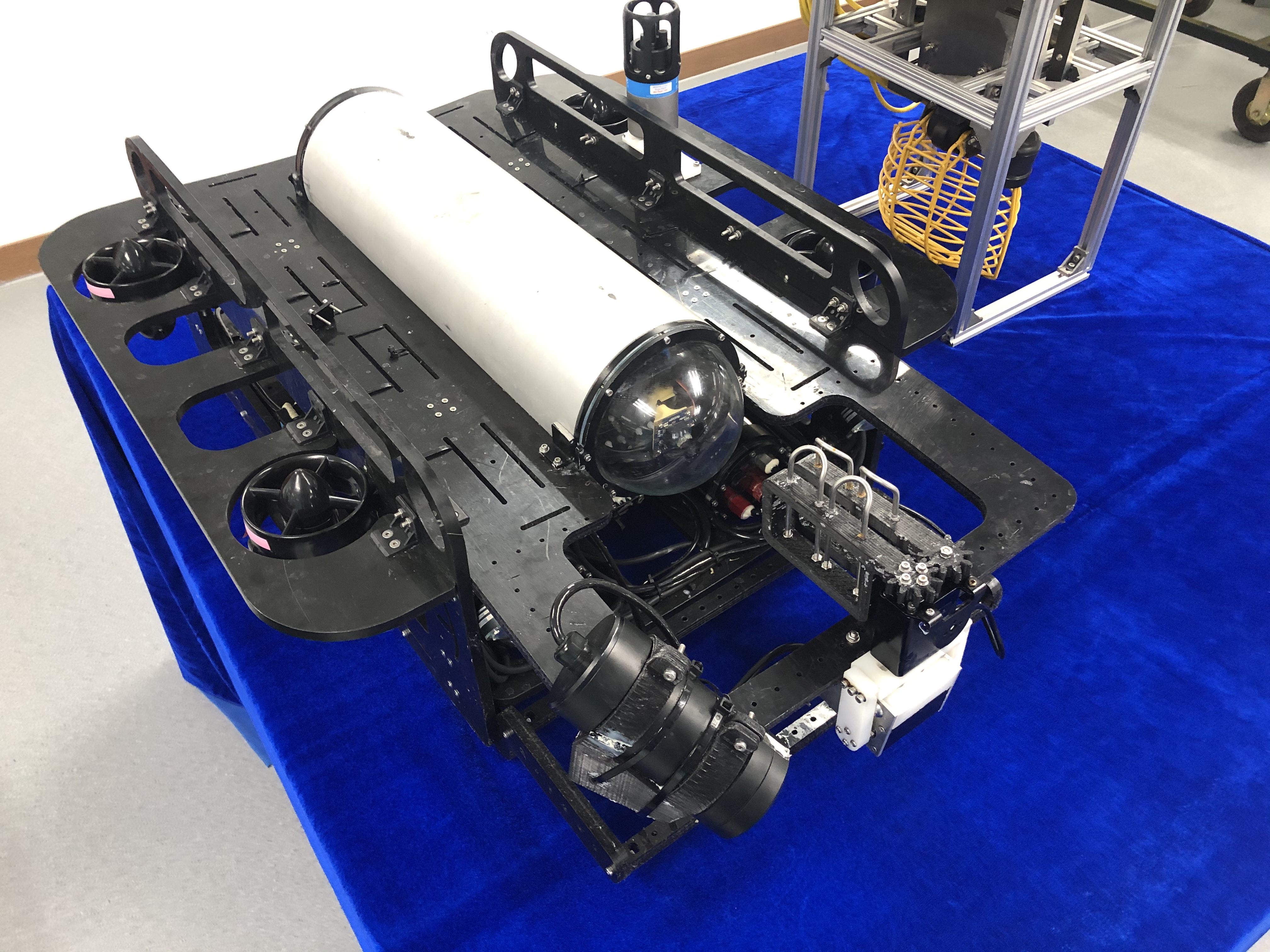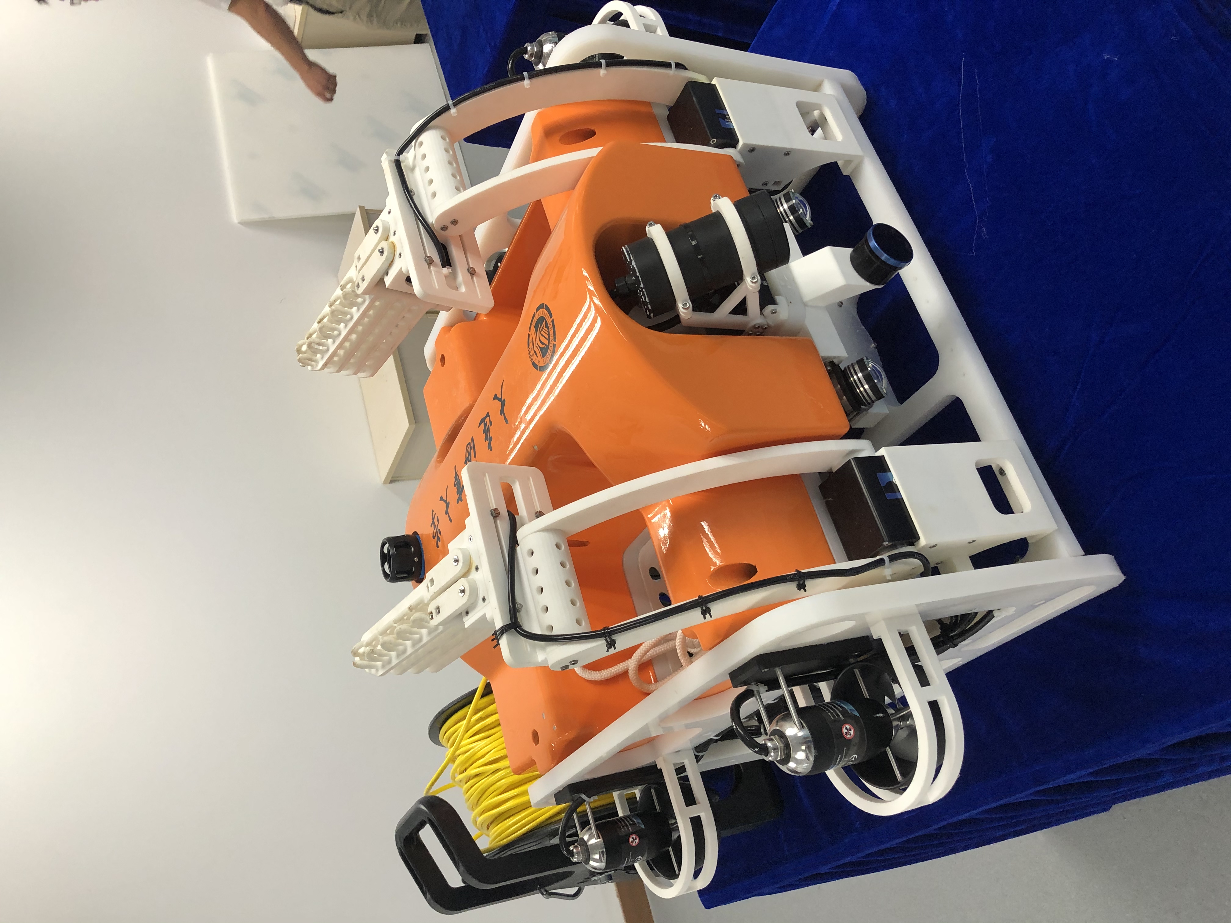 “海大大”号机器人是大连海事大学研发的第四代水下机器人,重约30公斤,最大深度可达200米,最大航速4节,无线方式可以3小时不间断工作。参赛队员介绍说,海大大采用八轴推进器,动力充沛,行动敏捷,控制稳定,不仅能够快速上升、下潜、灵活调整姿态,也可以完成侧翻、倒立等高难度动作。“根据去年参赛的经验,我们设计了全新的机械手,能够灵巧快速地抓取水下目标。具有定深巡航、声呐探测、水下目标自动识别等功能,可用于水下场景的观测,以及水下目标的智能检测与自主抓取。”