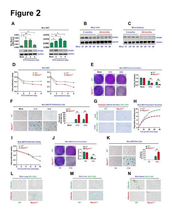 Figure 2. MYSM1 correlates with senescence. (A–C) C57BL/6 mice MEFs were treated with ETO or DOX (A). Kidney (B) and lung (C) tissues were excised from 2- and 22-month old WT mice (n=4 per group). MYSM1 and GAPDH protein levels were assessed by WB. (D–F) WT or Mysm1-/- mice MEFs were pre-treated with ETO or DOX for 48 h to induce senescence. Cell proliferation was determined (D). Colony formation was analyzed by crystal violet staining (E). SA-b-Gal activity was determined by X-gal staining (F). (G) 2-months old WT and Mysm1-/- mice were exposed to ionizing radiation (n=3 per group). SA-b-Gal activities in the lung and liver were determined by IHC. (H–K) WT or Mysm1-/- MEFs were grown continuously for different passages (P) or on different days (D). Population doubling levels were determined (H). Cell proliferation was measured (I). Colony formation was analyzed (J). SA-b-Gal activities were determined by X-gal staining (K). (L–N) SA-b-Gal activities in the lung (L), liver (M), and spleen (N) of 2- and 6-month-old WT and Mysm1-/- mice were determined by IHC analysis (n=3 per group). Scale bars =50 µm. Data presented as the mean ± SD. Statistical analyses were performed using an Unpaired t-test in Prism software. *p<0.05, **p<0.01, ***p<0.001. n.s. = no significance.