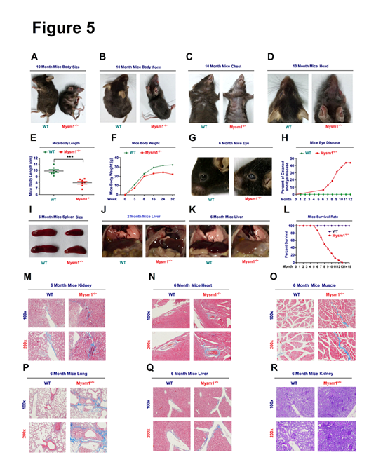 Figure 5. MYSM1 deficiency reduces the lifespan of mice. (A–D) Images of the body size (A), body form (B), chest (C), and head (D) of 10-month old WT and Mysm1-/- mice. (E) Analysis of body lengths (cm) of 2-month old WT and Mysm1-/- mice (n=7 per group). (F) Analysis of body weights of WT and Mysm1-/- mice (n=3 for each time-point). (G) Images of the eyes of 6-month old WT and Mysm1-/- mice. (H) Frequencies of cataracts and eye diseases in WT mice (n=16) and Mysm1-/- mice (n=17). (I) Images of spleens of 6-month old WT and Mysm1-/- mice (n=5 per group). (J) Images of livers of 2-month old WT and Mysm1-/- mice (n=5 per group). (K) Images of liver of 6-month old WT and Mysm1-/- mice (n=5 per group). (L) Survival rates of WT mice (n=6) and Mysm1-/- mice (n=7). (M–Q) Masson’s trichrome staining images of kidney (M), heart (N), muscle (O), lung (P), and liver (Q) of 6-month-old WT and Mysm1-/- mice (n=3 per group). Scale bars,100×=100 µm, 200×=50 µm. (R) Periodic acid Schiff (PAS) histochemical staining analyses of 6-month old WT and Mysm1-/- mice kidney (n=3 per group). Scale bars,100×=100 µm, 200×=50 µm. Data are means ± SD. Statistical analyses were done by using Prism software by Unpaired t-tests. ***p<0.001.
