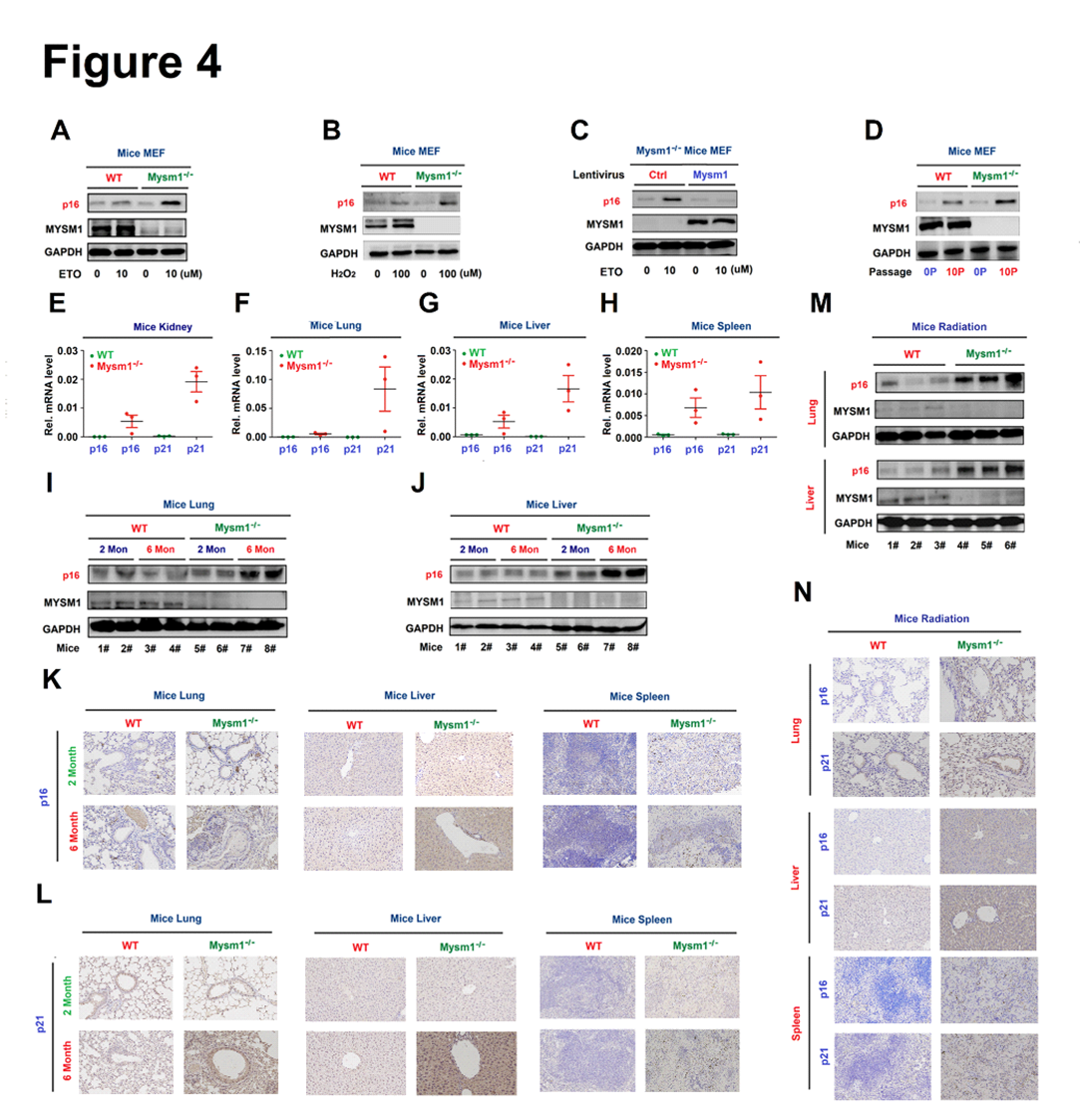 Figure 4. MYSM1 represses senescence in aged mice. (A–D) MEFs were treated with ETO (A) or H2O2 (B), infected with lentivirus expressing Mysm1 (C), or grown for different passages (D). p16, MYSM1, and GAPDH proteins were detected by WB. (E–H) p16 and p21 mRNA in the kidney (E), lung (F), liver (G), and spleen (H) of 6-month old WT and Mysm1-/- mice (n=3 per group) were determined by RT-PCR. (I and J) p16, MYSM1, and GAPDH proteins in the lung (I) and liver (J) of 2 and 6-month old WT and Mysm1-/- mice (n=3 per group) were detected by WB. (K and L) p16 protein (K) and p21 protein (L) in the lung, liver, and spleen excised from 6-month old WT and Mysm1-/- mice (n=3 per group) were measured by IHC. Scale bars, 50 µm. (M and N) 2-month-old WT and Mysm1-/- mice (n=3 per group) were exposed to IR. p16, MYSM1, and GAPDH protein levels in the lung and liver were determined by WB (M). p16 and p21 protein levels in the lung, liver, and spleen were analyzed by IHC. Scale bars =50 µm (N). Data are means ± SD. Statistical analyses were performed using an Unpaired t-test in Prism software. n = 3 for each sample group. n.s. = no significance.