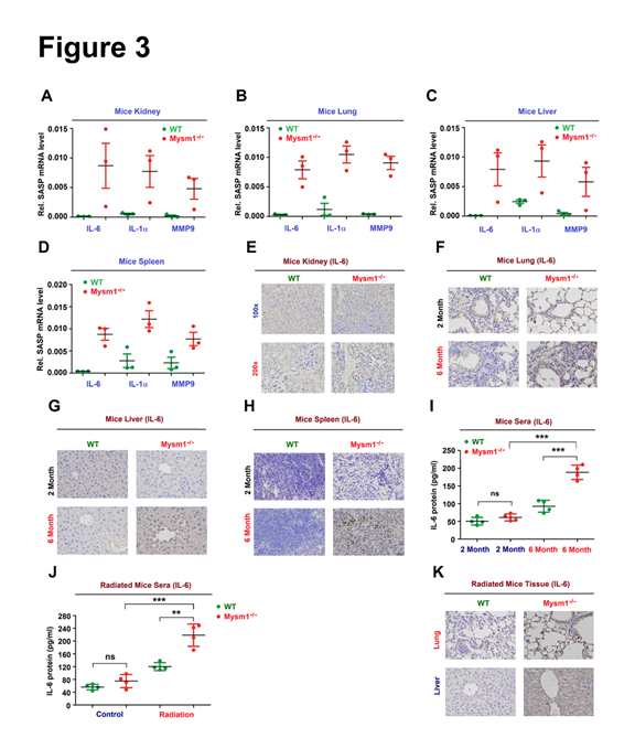 Figure 3. MYSM1 suppresses DDR-associated SASP. (A–D) IL-6, IL-1b, and MMP3 mRNA levels in the kidney (A), lung (B), liver (C), and spleen (D) excised from 6-month-old WT and Mysm1-/- mice (n=3 per group) determined by RT-PCR. (E–H) IL-6 protein in the kidney (E), lung (F), liver (G), and spleen (H) excised from 6-month-old WT and Mysm1-/- mice (n=3 per group) analyzed by IHC. Scale bars = 50 µm. (I) IL-6 protein in the sera from 6-month-old WT and Mysm1-/- mice (n=3 per group) measured by ELISA. (J and K) 2-month-old WT and Mysm1-/- mice were exposed to IR (n=3 per group). IL-6 protein in the sera was measured by ELISA (J). IL-6 protein in the lung and liver was analyzed by IHC. Scale bars = 50 µm (K). Data are means ± SD. Statistical analyses were performed using an Unpaired t-test in Prism software. *p<0.05, **p<0.01, ***p<0.001. n.s. = no significance.