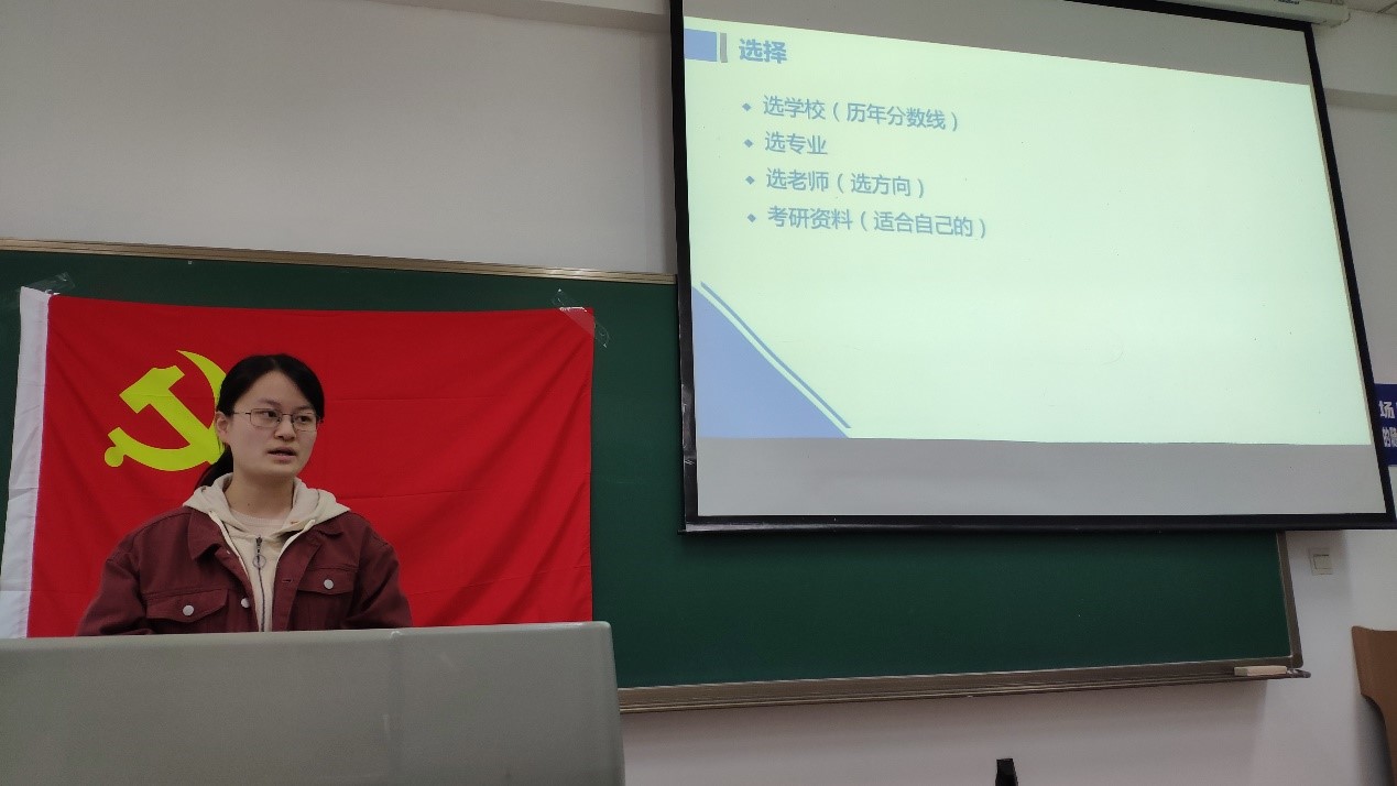 首先,支部书记荣禄禄为本次分享会做开场发言,她表示不论同学们将来选择读研还是就业,希望本次学长学姐们的分享能为同学们找到努力的方向。