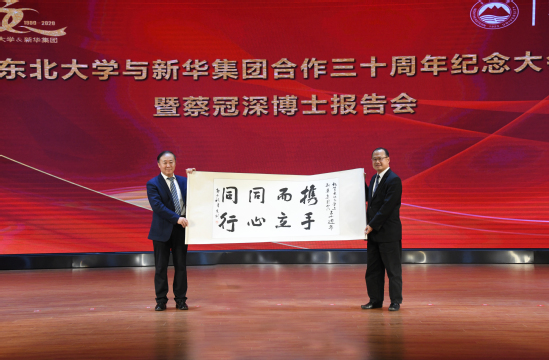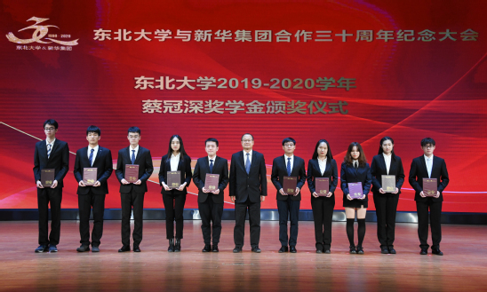 会上举行了2019-2020学年东北大学蔡冠深奖学金、教育建设基金奖学金颁奖仪式,赵继向蔡冠深先生赠送书法作品和三十年合作纪念册。全体与会人员观看了东北大学与新华集团三十年合作宣传片。