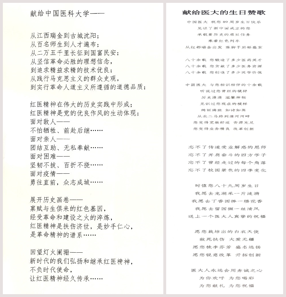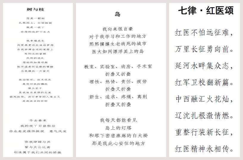 比赛要求参赛职工围绕医大建校89周年,职工给学校献礼为主题,通过诗歌的方式歌颂、表达爱校情怀,字数不限,五言律诗、七言律诗、打油诗、现代诗等诗歌形式均可。比赛面向创新学院全体职工,为期一周,涌现出诸多优秀诗歌作品。其中,张轶欧创作的七律诗《红医颂》既回顾了校史,又表达了对医大未来的憧憬,文笔精炼、词句工整、耐人寻味;李博勋的一首《树与枝》采用了虚实相间的手法,将校园拟人化,彰显着作者对医大真挚而又浓烈的热爱;赵南的《献给中国医科大学》全诗语言流畅、直抒胸臆,解读了红医精神的内涵,点明题旨;张文竹的《岛》将个人归属感注入诗歌中,用岛来烘托人物的心境,层层渲染,使诗歌肌理细腻,更富有艺术的感染力。