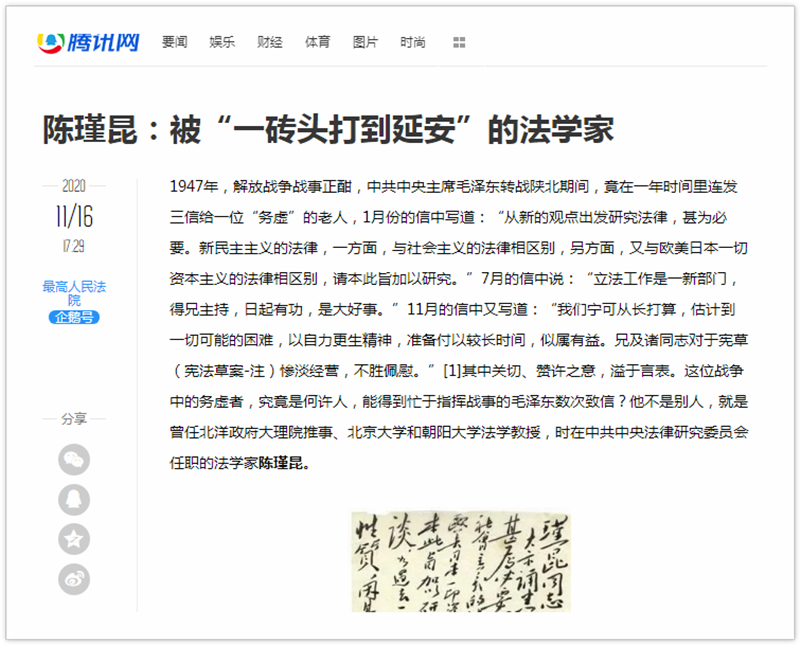 继续教育培训网首页近日,人文与经法学院韩伟副教授在“中国法院博物馆”、“最高人民法院”官方微信公众号发表题为“陈瑾昆:被‘一砖头打到延安’的法学家”的文章,介绍为新中国的法制建设作出了重要贡献的法学家、法学教育者陈瑾昆,文章被腾讯网、澎湃网等多家网络媒体转载。