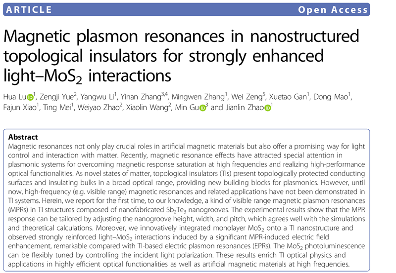 研究成果以“Magnetic plasmon resonances in nanostructured topological insulators for strongly enhanced light-MoS2interactions”为题,在国际光学顶尖期刊《Light: Science & Applications》上发表。论文第一作者为陆华副教授,通讯作者为赵建林教授、陆华副教授及上海理工大学张轶楠研究员。论文链接:https://www.nature.com/articles/s41377-020-00429-x