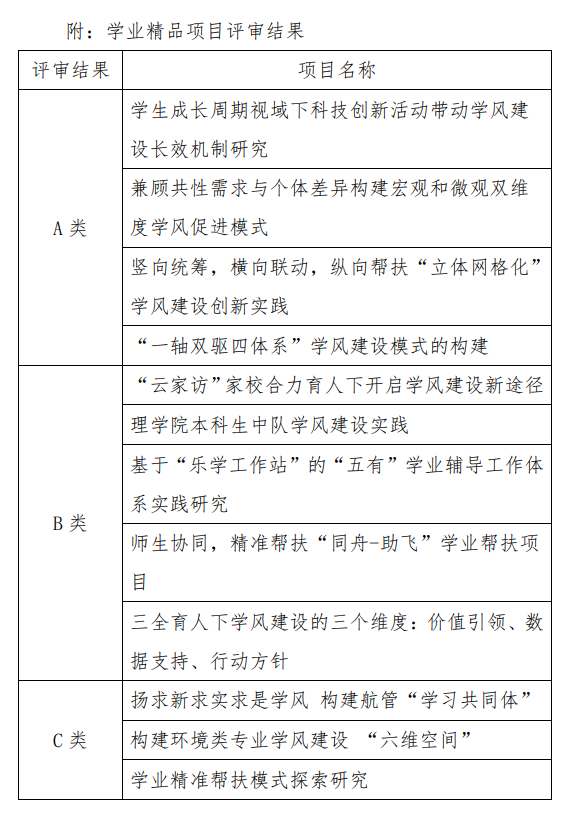 各学院结合学院办学特点和学生实际,依托学风建设大调研大讨论活动载体,围绕各自的工作基础、具体举措、创新性及重点难点、取得实效等方面进行了工作交流,梳理总结了学风建设的经验思路和特色做法,涌现出《学生成长周期视域下科技创新活动带动学风建设长效机制研究》《兼顾共性需求与个体差异构建宏观和微观双维度学风促进模式》等优秀学业精品项目。