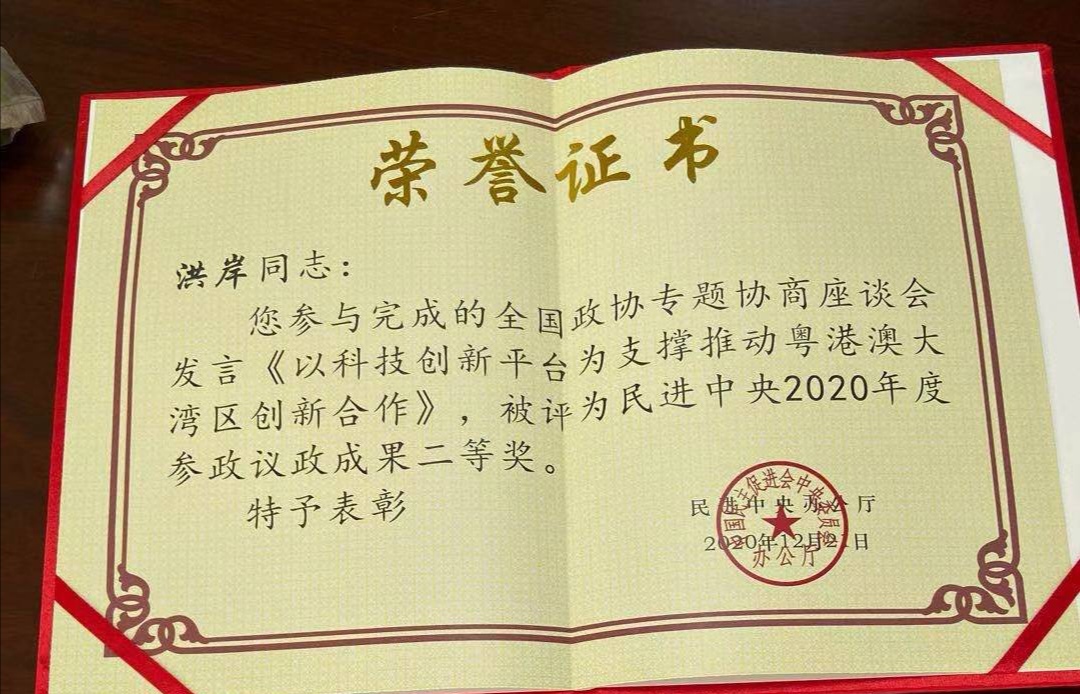 继续教育培训网首页近日,民进中央2020年度参政议政成果奖揭晓,民进暨大总支副主委、暨南大学副校长洪岸研究员参与完成的题为《以科技创新平台为支撑推动粤港澳大湾区创新合作》的调研,被采纳为民进中央在全国政协专题协商座谈会上的发言内容,获得较好反响,被评为民进中央2020年度参政议政成果二等奖。