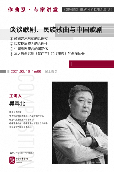 吴老师从歌剧艺术形式的话语权、民族歌剧称谓的合理性、中国歌剧舞台的国际化、本人创作歌剧《楚庄王》和《田汉》的创作体会,这四个方面系统论述了他对中国歌剧与中国民族歌剧音乐创作的理解与认识。