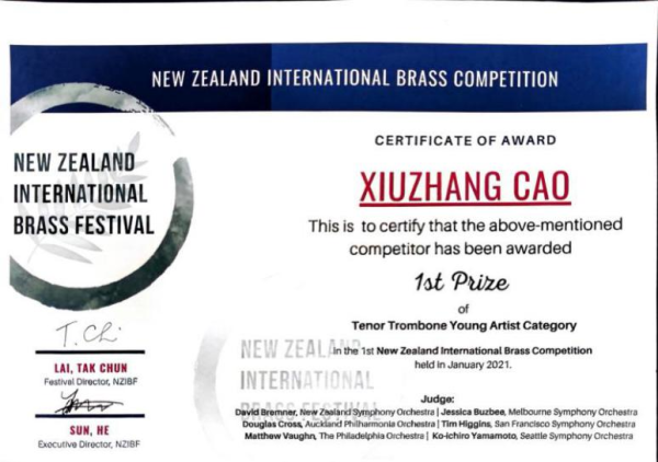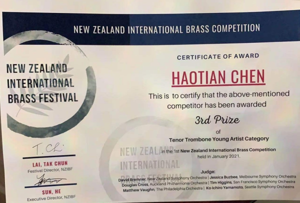继续教育培训网首页2021年1月, 我校附中高一年级学生曹修章同学和大一年级学生陈浩田同学分别获得第一届新西兰国际铜管比赛(NZIBC)长号青年组第一名和第三名,指导教师为郭澎远副教授。