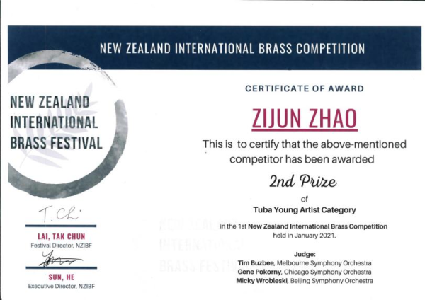 我校附中高二年级学生赵子竣获得第一届新西兰国际铜管比赛(NZIBC)大号青年组第二名,指导教师为李旌佐老师。