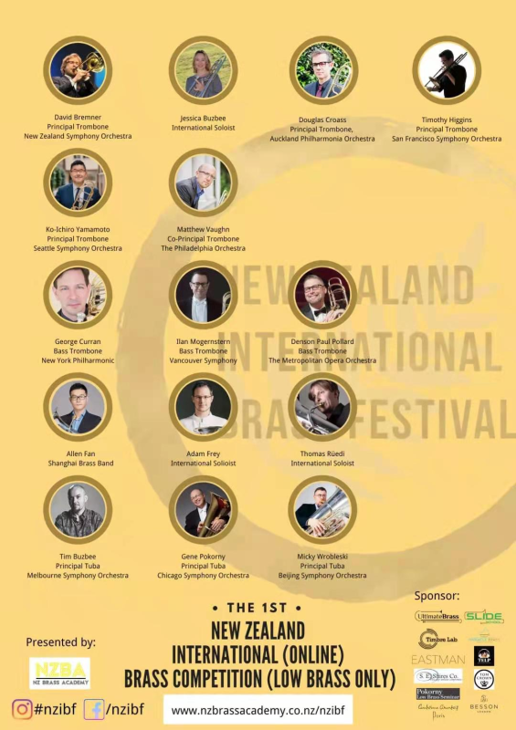 邀请了来自世界顶级乐团的教师和评委。新西兰国际铜管比赛旨在发现和培养来自世界各地的年轻,有才华的管乐演奏家,并给他们一个机会来分享友谊和文化交流。本次比赛是世界上为数不多的举办包括圆号、小号、次中音长号、低音长号、管风号、大号、铜管五重奏等铜管乐器组的比赛。