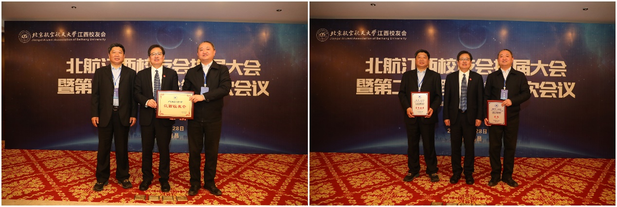 北航校友联络发展处处长、校友总会秘书长王有洪向江西校友会颁发会牌,向名誉会长朱俊、会长姜晓春颁发聘书。新任会长姜晓春向顾问颁发聘书,名誉会长朱俊向常务副会长、副会长颁发聘书。常务副会长李忻农向秘书长、常务秘书长、执行秘书长等颁发聘书。