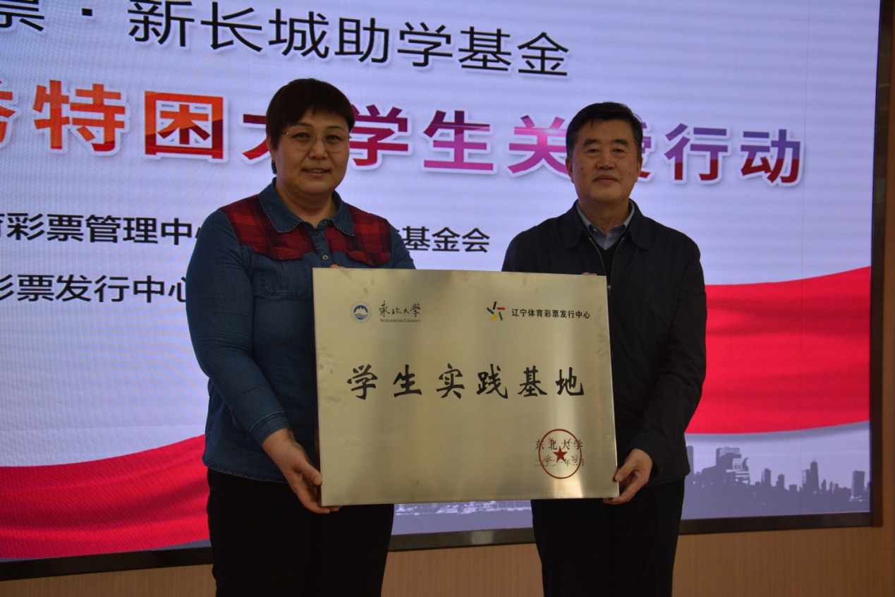 杨明向辽宁省体彩中心学生实践基地授牌,校方代表与省体彩中心代表共同签署了共建学生实践基地协议。