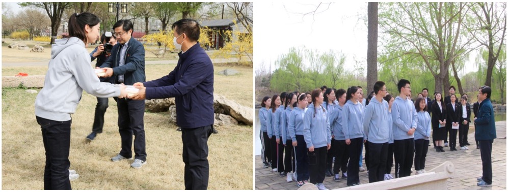 祭奠忠魂寄哀思,学习党史念初心。在“三一八”革命烈士纪念碑前,全体师生肃立默哀一分钟,缅怀先烈,寄托哀思,祭奠为了民族独立解放而献出宝贵生命的英烈们。“一朵鲜花,一声问安”,师生寂静肃穆,有序走到革命烈士纪念碑前深深鞠躬,敬献鲜花,向革命先烈致以崇高敬意。面向鲜红的团旗,全体共青团员重温入团誓词,牢记共青团“永远跟党走”的初心和使命。