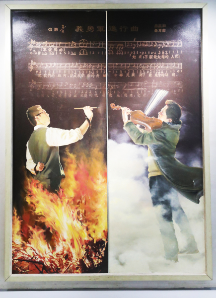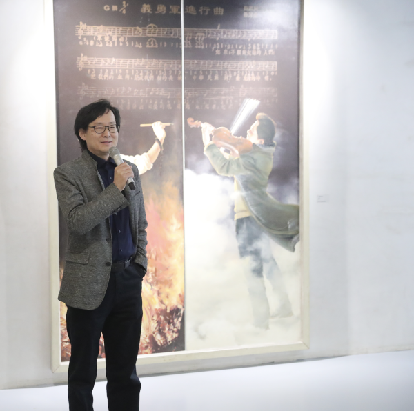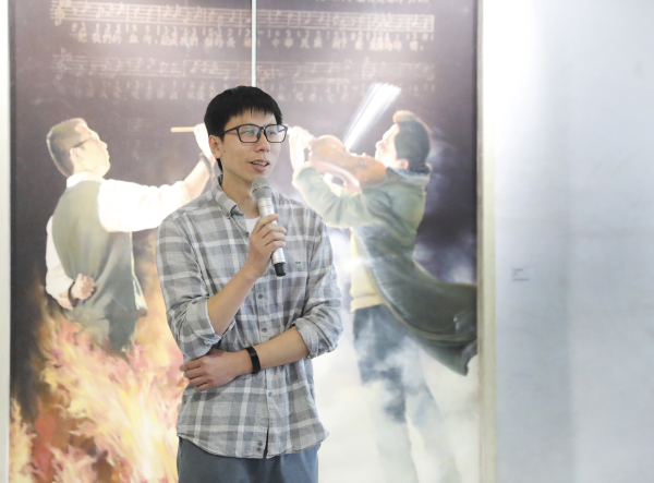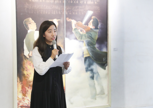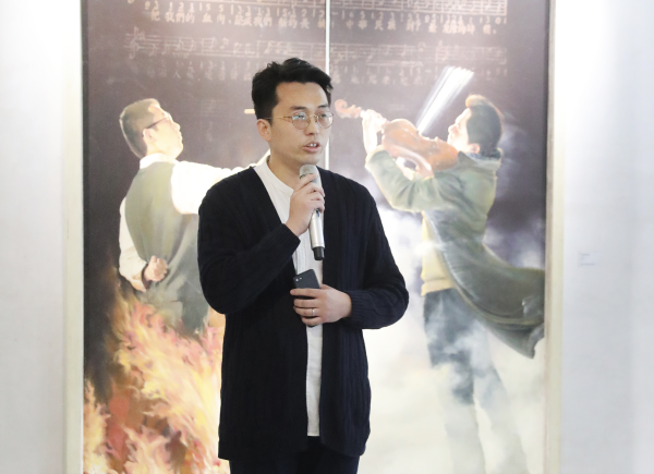 绘画《义勇军进行曲》作者贺鹏琪代表参展艺术家发言。他讲到,音乐和美术是两种不同的艺术形式,是两种最具代表性的艺术语言,绘画是凝固的音符,音乐是流淌的笔触,相信两者的结合会迸发更加绚丽的艺术之光。
