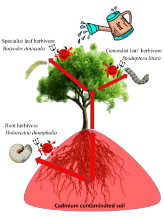由于重金属对昆虫有一定的生物学毒性,元素防御假说认为当重金属被植物吸收并富集在体内后可以在一定程度上增强植株的抗虫性。该假说为预测在重金属污染地内自然生长的植被类型、空间分布格局及病虫害发生程度有重要的指导意义。但是现有大多数对该假说的研究都以高富集草本植物为对象,对低富集的木本植物罕有报道。本课题组在前期的研究中首次证实该假说也适用于一种木本植物-杨树上。该研究首次证实了向受镉胁迫的杨树增施外源亚精胺,可在缓解杨树受镉毒害的同时增强植株的抗虫性。