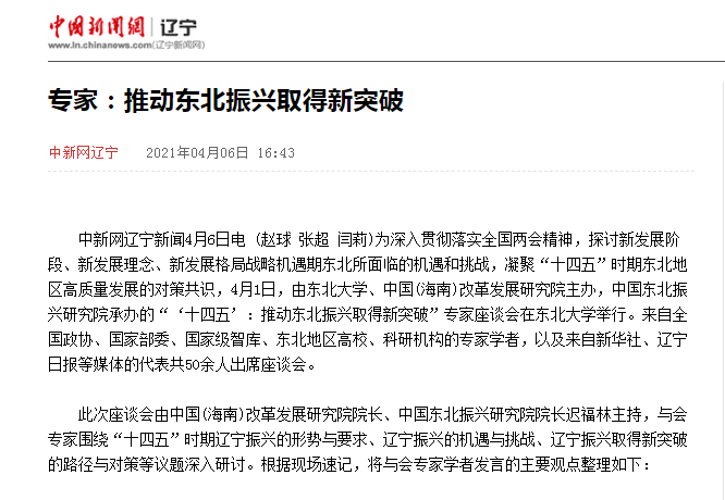 中新网辽宁新闻4月6日电 (赵球 张超 闫莉)为深入贯彻落实全国两会精神,探讨新发展阶段、新发展理念、新发展格局战略机遇期东北所面临的机遇和挑战,凝聚“十四五”时期东北地区高质量发展的对策共识,4月1日,由东北大学、中国(海南)改革发展研究院主办,中国东北振兴研究院承办的“‘十四五’:推动东北振兴取得新突破”专家座谈会在东北大学举行。来自全国政协、国家部委、国家级智库、东北地区高校、科研机构的专家学者,以及来自新华社、辽宁日报等媒体的代表共50余人出席座谈会。