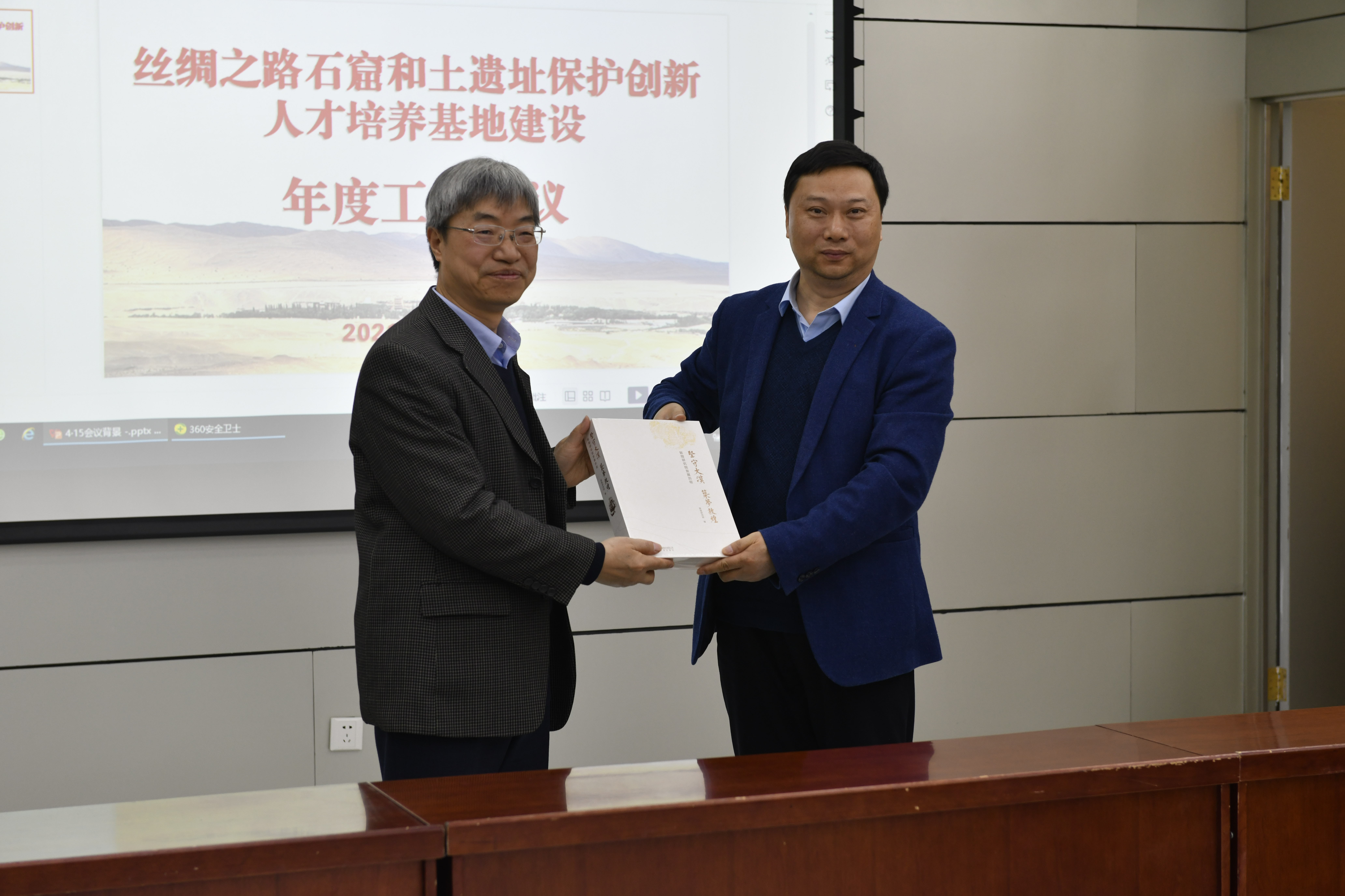 会后,赵声良为赖绍聪赠送书籍《坚守大漠 筑梦敦煌——敦煌研究院发展历程》。