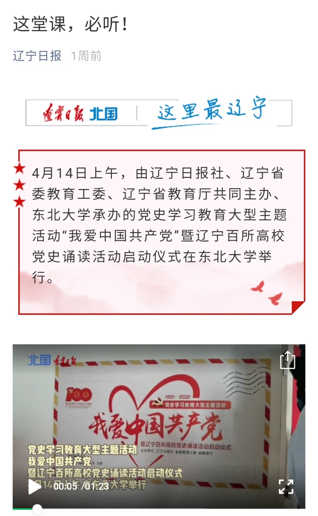 “我爱中国共产党”党史学习教育大型主题活动是辽宁日报庆祝建党百年大型融媒体项目的重要组成部分,继东北大学之后,还将在更多机关、企事业单位、社区等地开展活动。