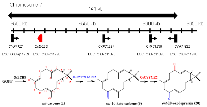 植保素是重要次生代谢产物,具有广谱抗菌性,是植物主要的化学防御机制。水稻中已经鉴定的两个植保素合成基因簇涵盖了大部分二萜植保素的生物合成基因,但casbane型二萜植保素ent-10-oxodepressin的代谢机制还未被解析。该研究成功鉴定了水稻中的第三个植保素合成基因簇c7BGC并全面解析了其在ent-10-oxodepressin生物合成的生物学功能。该研究首先成功克隆了水稻的ent-casbene合酶基因(OsECBS),利用多种技术手段,成功解析了OsECBS主产物ent-casbene的化学立体构型,进一步表达分析鉴定了OsECBS与4个细胞色素P450氧化酶基因构成的c7BGC基因簇,解析阐明了c7BGC参与ent-10-oxodepressin生物合成的整个通路,同时证明了OsECBS生物合成途径参与水稻抗稻瘟病的生物学功能。