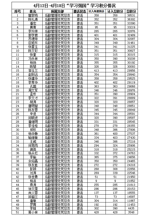 后管处党总支51名党员每天上“学习强国”已成为一种常态,大家以“学习强国”为友,随时通过看新闻、在线答题等方式,学习党史,了解我党百年艰辛坎坷历程,学习无数革命先辈的智慧和力量。在这群党员中,有很多是来自一线的工人,他们虽然文化程度不高,却有着一颗敬党爱国的上进心,他们不怕吃苦,甘于奉献,在学校最基层发挥着党员先锋模范的作用,有的党员在识字非常有限的情况下,仍然刻苦学习党史,通过收听音频、观看视频的方式,了解最新动态新闻,并把精神传递到身边每一位保洁员、维修员、搬运工等等心里。正是这样一只朴素的队伍,却提交了十分优异的答卷。截止作者发稿前,后管处党总支51名党员中,有18名同志入围中共四川农业大学党委学习标兵,16人总分超过30000分 ,人均26300分,宿管科曾家鸣同志更是以38900分的优异成绩稳居中共四川农业大学党委学习组榜首。