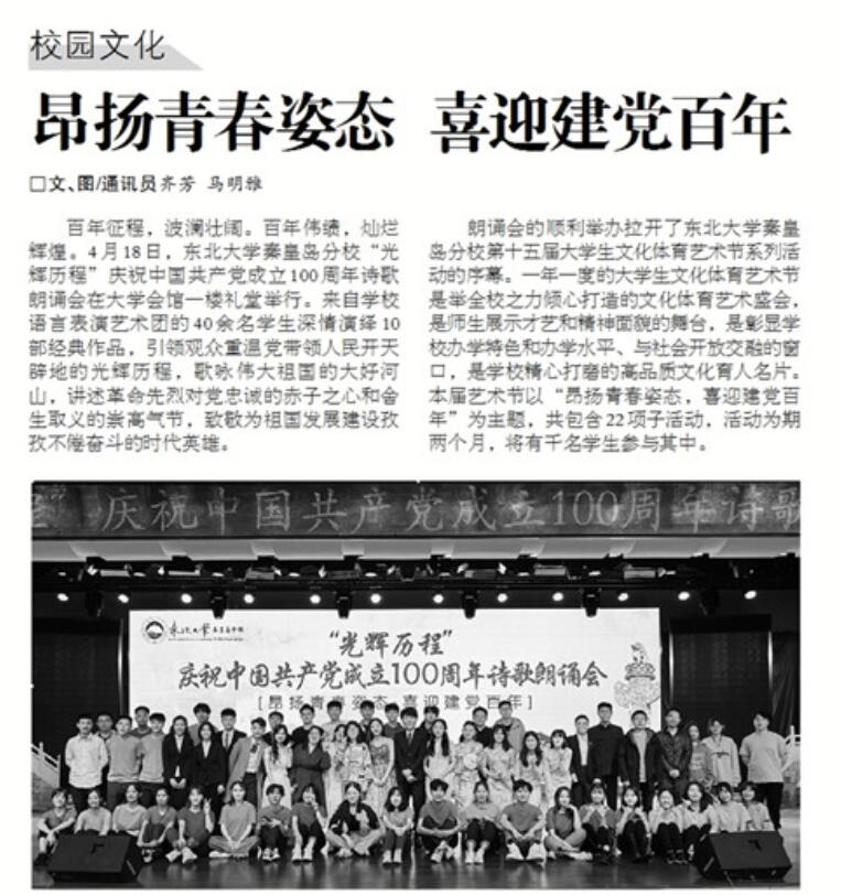 百年征程,波澜壮阔。百年伟绩,灿烂辉煌。4月18日,东北大学秦皇岛分校“光辉历程”庆祝中国共产党成立100周年诗歌朗诵会在大学会馆一楼礼堂举行。来自学校语言表演艺术团的40余名学生深情演绎10部经典作品,引领观众重温党带领人民开天辟地的光辉历程,歌咏伟大祖国的大好河山,讲述革命先烈对党忠诚的赤子之心和舍生取义的崇高气节,致敬为祖国发展建设孜孜不倦奋斗的时代英雄。