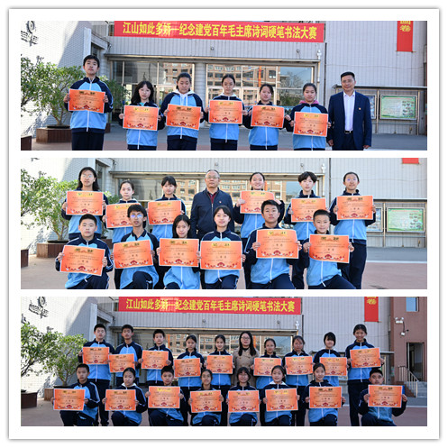 近日,附属学校组织七、八年级学生进行“毛主席诗词”硬笔书法比赛。初选环节由附属学校团委组织开展,参赛班级以班级为单位选择同一首诗词,进行钢笔字比赛,每个班级选择十副参赛作品送交各年级语文老师进行第二次甄选。比赛最终在每个班级评出一等奖一人、二等奖两人、三等奖三人、优胜奖四人。4月28日下午,颁奖仪式在学校操场举行,初中全体师生参加仪式。附属学校校长姚长福,副校长车振林、陈媛媛分别为获奖学生颁奖,并合影留念。