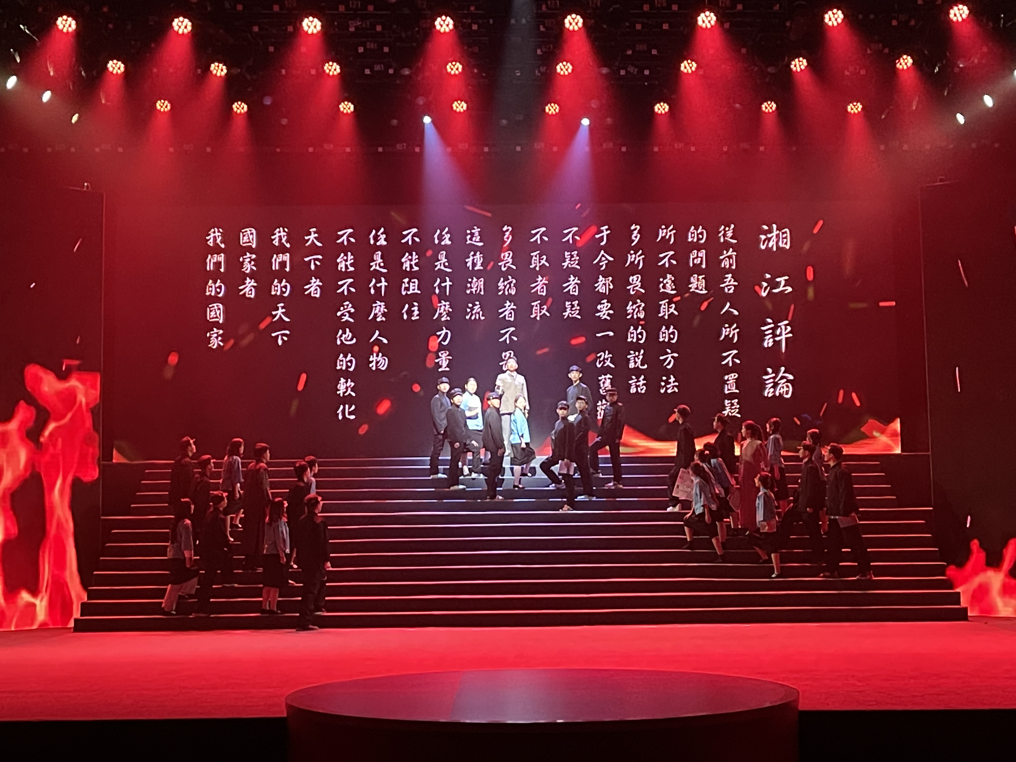 表演过程中,舞台屏幕投影出五四运动的历史场景,背景乐激昂,舞台中央的学生演员身着长衫、中山装、学生装等服装,以独白、旁白、演绎穿插的形式演绎百年前中国青年的热血沸腾。