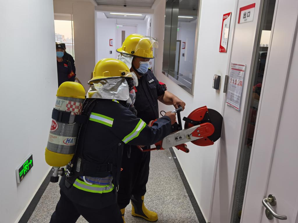 针对教学实验室燃气安全风险,演练活动预先设定实验场所燃气爆炸引发火灾,紧急动员集结、紧急穿戴装备赶赴事发现场;在假想遭遇安全出口锁死的情况下,救援人员动用无齿锯等重型破拆装备,强行破拆实施救援,丰富了校内应急救援力量的实战经验。