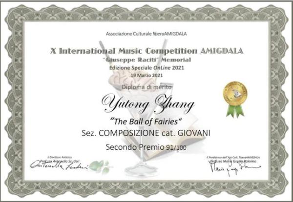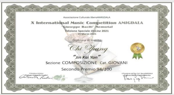 2021年在意大利举办的第十届“阿米加拉国际音乐比赛”中,附中高二年级张羽彤同学的七重奏作品《仙女的舞会》(The Ball of Fairies)获得少年组二等奖(指导教师:杜咏)。高一年级张驰同学的室内交响乐作品Jin Kai Yan《尽开颜》获青年组二等奖(指导教师:邹航)。“阿米加拉国际音乐比赛”是在意大利举办的一年一度的国际性音乐比赛,得到当地政府和众多音乐家的大力支持。