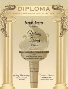此外,张羽彤同学2021年1月凭借钢琴作品《漫步秋天》(Walking in Autumn)在美国举行的金钥匙钢琴作品作曲比赛中(Golden Key Music Festival Piano Composition Competition)获得高级组第二名,同时受到组委会邀请,于今年7月底赴奥地利维也纳参加艺术节亲自演奏自己的作品。