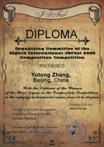 张羽彤同学芬兰西贝柳斯国际作曲比赛获奖证书