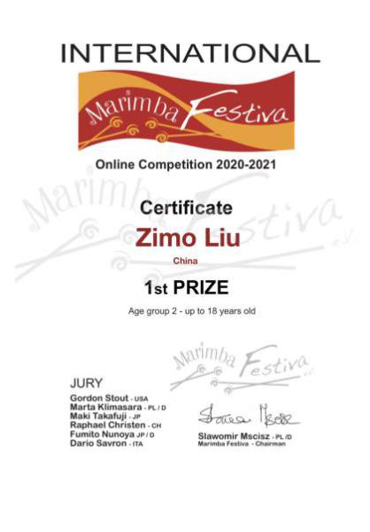 2021年四月十八日,在德国班贝格举办的2021班贝格国际马林巴大赛(International Marimba Festiva Competition2020~2021)决赛中(由于疫情在线上进行比赛),中央音乐学院附中高二年级刘子墨同学、高一年级张柏杨同学、初三年级戴金同学、初一年级孙嘉艺同学分别获得年龄2组第一名、年龄2组第二名、年龄1a组第一名和年龄1b组第一名奖项。