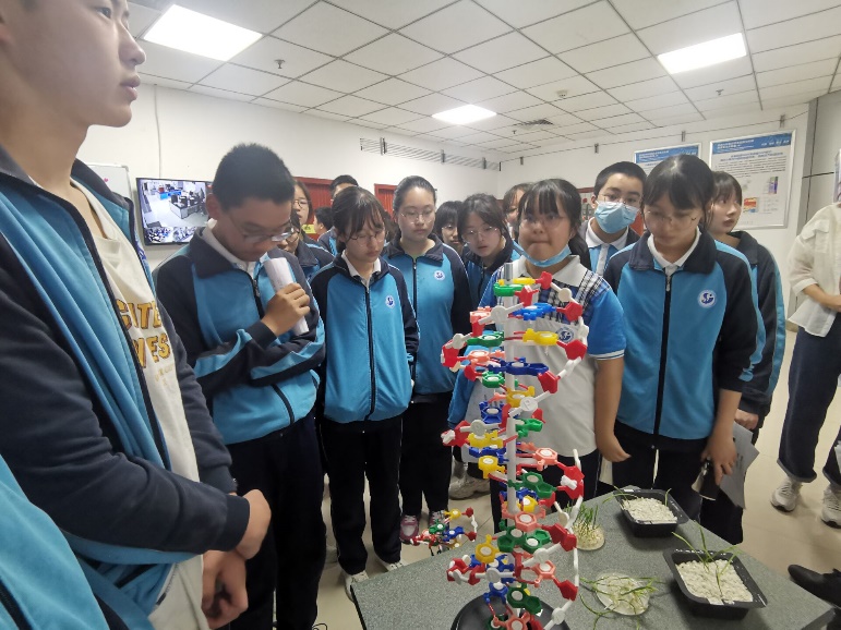 同学们还参与DNA模型组装互动体验,在老师的讲解下进一步通过DNA双螺旋模型去领悟生物中心法则,与实验室科研人员现场交流,表现出了对作物和生命科学的极大兴趣。