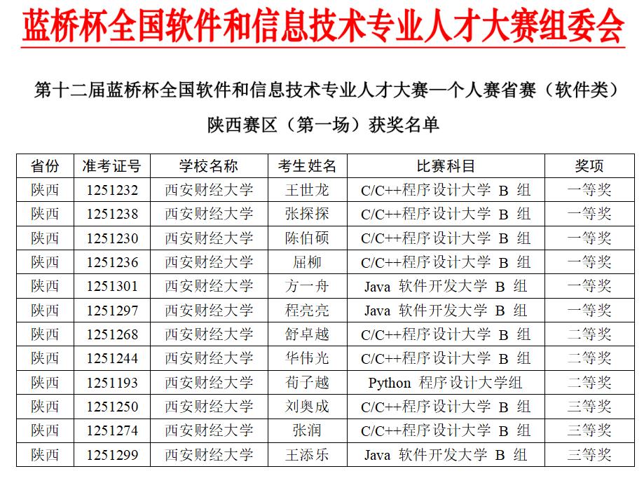 继续教育培训网首页近日,2021年第十二届“蓝桥杯”全国软件和信息技术专业人才大赛陕西赛区成绩揭晓,我校信息学院杨新安、李翠、陆伟、周延杰、史西兵、吉胜军、刘通和冯居易老师指导的参赛学生获得陕西赛区一等奖6项、二等奖3项和三等奖3项。获得陕西赛区一等奖的6名同学将代表我校参加全国总决赛,鉴于我校多年来的优秀成绩,组委会同时授予我校优胜学校和优秀组织单位奖。