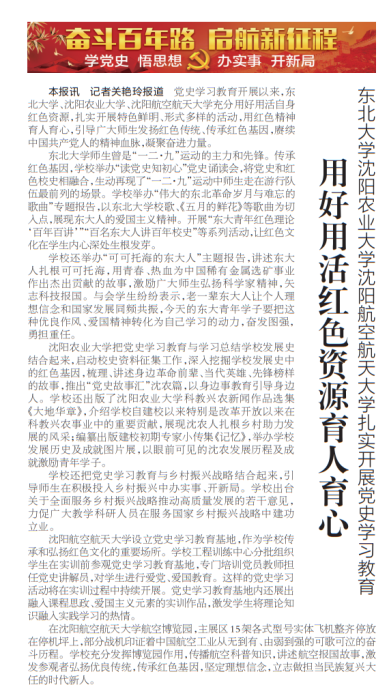 党史学习教育开展以来,东北大学、沈阳农业大学、沈阳航空航天大学充分用好用活自身红色资源,扎实开展特色鲜明、形式多样的活动,用红色精神育人育心,引导广大师生发扬红色传统、传承红色基因,赓续中国共产党人的精神血脉,凝聚奋进力量。
