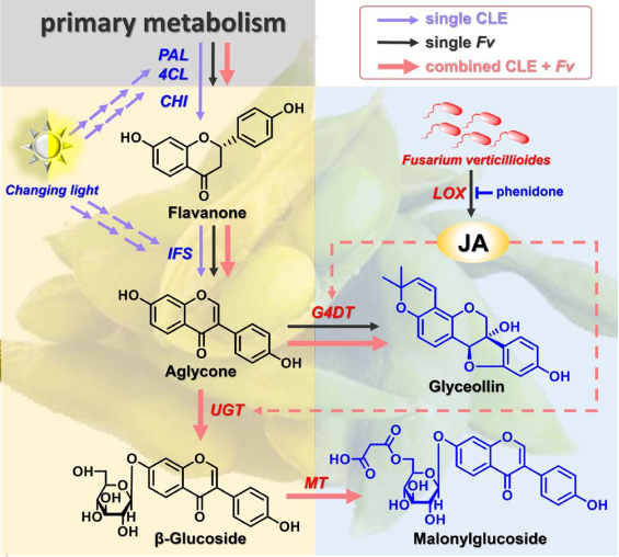 Fusarium verticillioides等田间真菌病害导致大豆品质低劣、产量降低,是南方大豆生产的重要瓶颈。种荚是豆科植物抵御外界环境胁迫的第一道防线,对大豆田间霉变具有积极的防御作用。玉米-大豆带状复合种植模式下,大豆种荚霉变发生率显著降低,但其原因尚不清楚。同时玉米-大豆套作变光环境能促进大豆籽粒中异黄酮的合成积累(Food Chem, 2016, 207: 107-114)。本研究通过多年的田间模拟试验,探究了不同生育时期遮荫条件下,大豆种荚霉变抗性及代谢群体的变化规律;证实了变光环境,特别是“营养生长期荫蔽-生殖生长期复光”处理能显著提高大豆豆荚的霉变抗性。代谢组学分析和外源茉莉酸及其合成抑制剂处理试验,进一步揭示了变光环境与豆荚内源茉莉酸对异黄酮合成及霉变抗性具有协同提升作用。变光环境通过促进豆荚中异黄酮合成通路上游组成型异黄酮苷元和葡萄糖苷的积累,为下游诱导型异黄酮(丙二酰基化异黄酮、大豆抗毒素)合成提供了充足前体物;当豆荚遭受霉菌侵染时,其茉莉酸信号通路启动,并进一步促进了诱导型异黄酮的合成,从而协同提高了豆荚的霉变抗性。