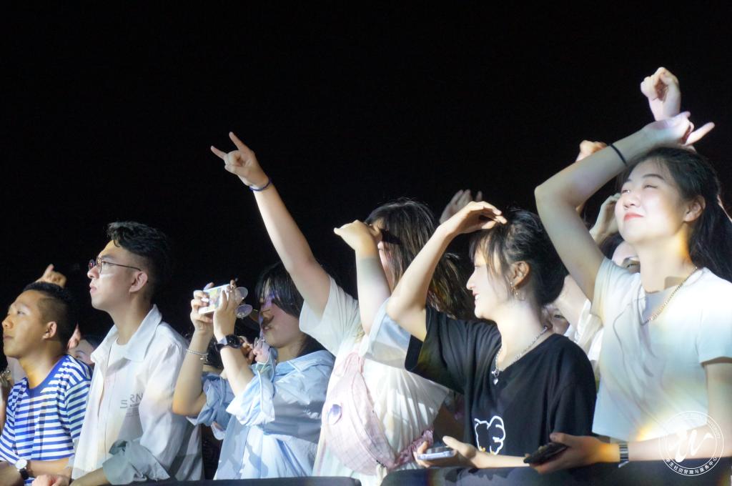 《殿堂之光》《华沙之吻》《solution》《他和她》等风格各异的曲目精彩亮相,时而喧嚣激昂金鼓齐鸣,抑或柔媚婉转低吟浅唱,动人旋律与动感节拍伴着舞台绚丽灯光闪耀整个操场。在主唱率性洒脱的演唱中,现场听众不由自主地随着律动的节拍欢呼蹦跳。